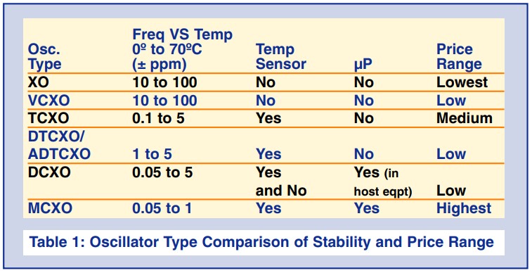 不同版本的TCXOs以及simple 用于比较的时钟(XO)和VCXOs。
