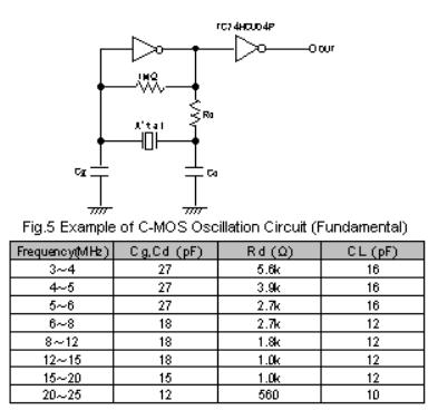 (3)当用于C-MOS振荡电路时,电路图中的Rd是不可或缺的。(见图5)。如果连接了该Rd,驱动水平将保持在规定值内,并且可以获得稳定的振荡频率。