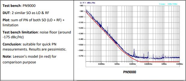 PN9000可以被描述为DCNTS的一个信道。使用2个相似的ULN SO作为参考(LO)和DUT,显示的PN是两个振荡器的PN+测试台的剩余PN的平方和。噪声基底的限制在-175dBc/Hz左右。每个石英晶体振荡器的单独PN不能直接实现。然而,它等于或优于显示的曲线。