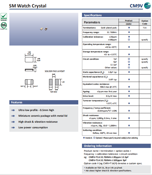Golledge晶振,压电石英晶体,CM9V晶振.普通贴片石英晶振外观使用金属材料封装的,具有高稳定性,高可靠性的石英晶体谐振器,晶振外观本身使用金属封装,充分的密封性能,可确保其高可靠性,采用编带包装,外包装采用朔胶盘,可在自动贴片机上对应自动贴装等优势.