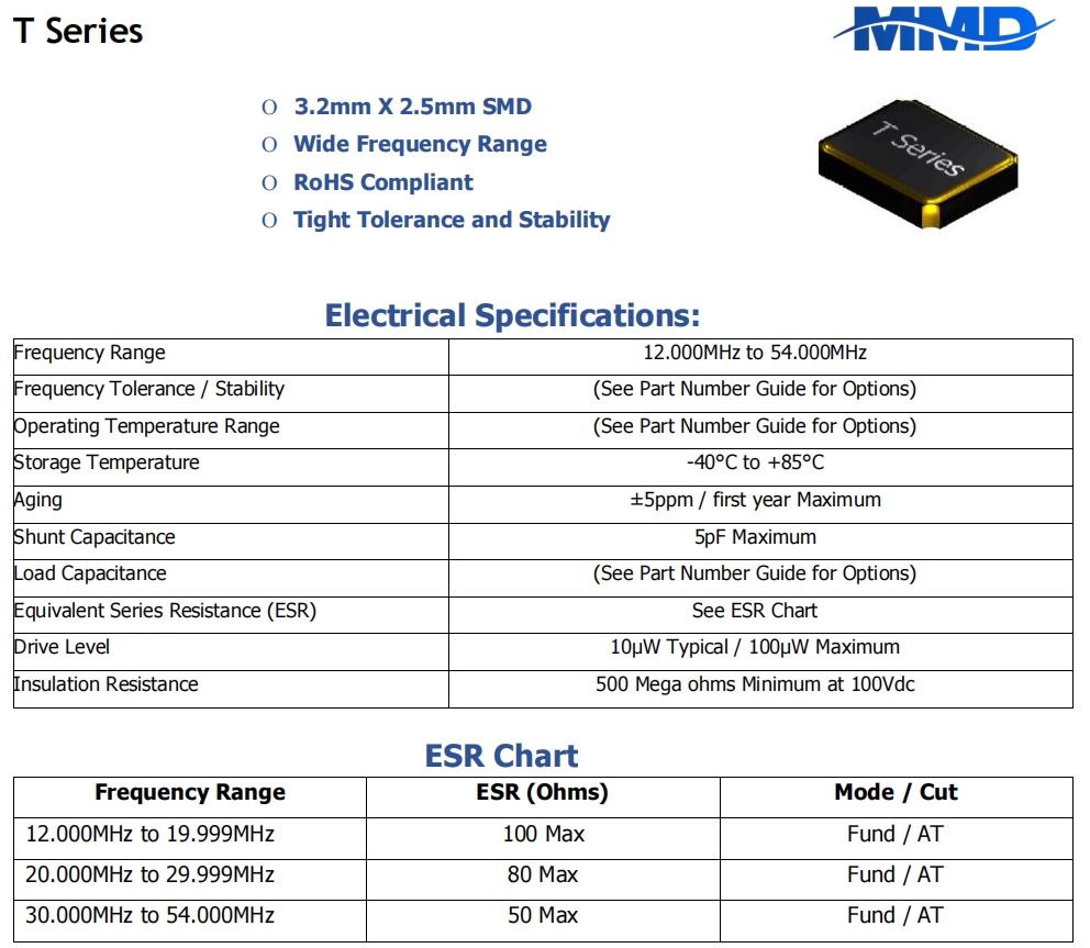 麦迪康智能家电晶振,T10GC1-19.200MHZ-T,T系列石英谐振器 参数表