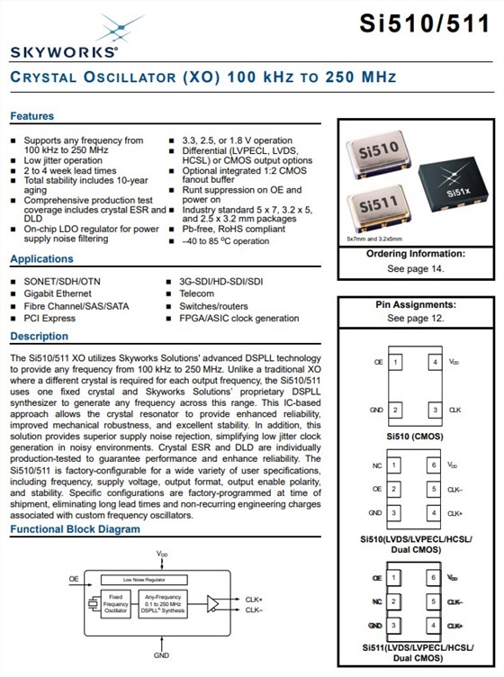 特征:支持来自的任何频率100千赫至250兆赫,低抖动操作,2到4周的交付周期,完全稳定性包括10年老化,综合生产测试 覆盖范围包括晶体ESR和 DLD,用于电源的片上LDO调节器 电源噪声滤波,3.3、2.5或1.8V工作电压,差分(LVPECL,LVDS, HCSL)或CMOS输出选项,可选集成1:2 CMOS 扇出缓冲器,OE上的残帧抑制和 通电,行业标准7.0x5.0mm,5.0x3.2mm,和3.2x2.5mm封装有源晶振,无铅,符合RoHS标准,–40至85摄氏度工作温度。