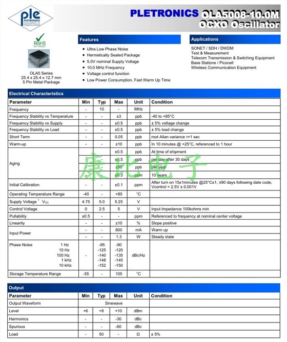 OLA5011-100.0M,正弦波输出晶振,OLA5振荡器,恒温石英晶振,美国普锐特晶振
